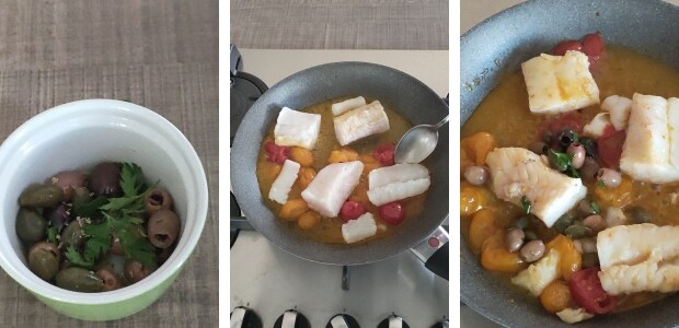 – Dans un bol, réunissez les olives, les câpres dessalées, le sel, le persil et 2 cuillères d’huile, mélangez bien et à la fin de la cuisson, ajoutez à la sauce.