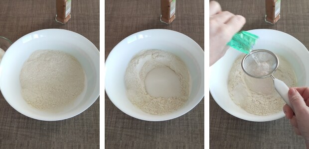 – Dans un grand bol, verser la farine déjà tamisée, le sucre et la levure chimique