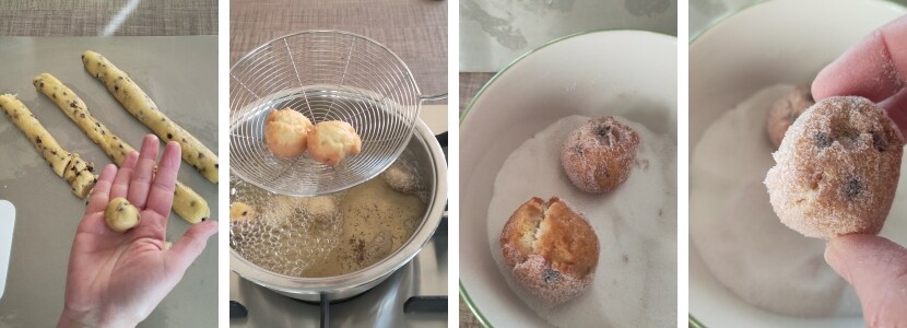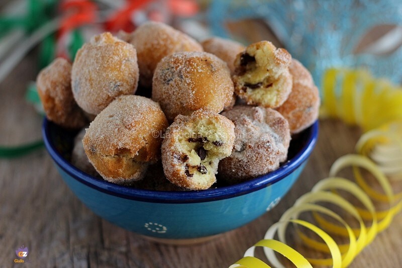 Les ingrédients se trouvent plus ou moins dans toutes les maisons… œufs, sucre, farine et beurre… puis elles sont frites dans une abondante huile et roulées dans le sucre pour les rendre super gourmandes ! Ensuite, il y a de nombreuses variantes comme dit… au miel… avec de la crème pâtissière… ou comme je les ai faites avec des pépites de chocolat !