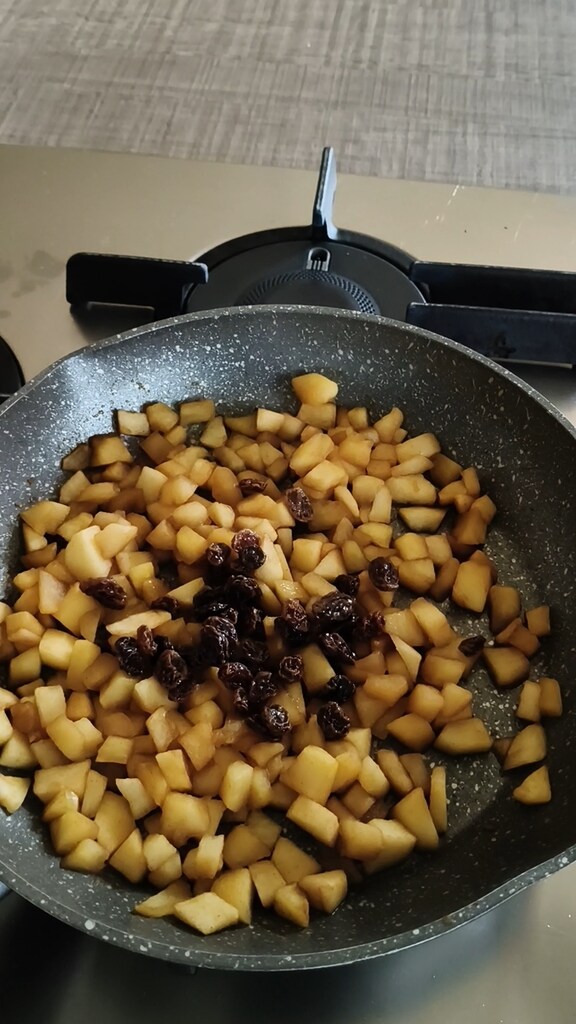 Ajouter les raisins secs préalablement trempés et égouttés, mélanger et éteindre. (Dans les conseils à la fin de la recette, vous trouverez les substitutions).