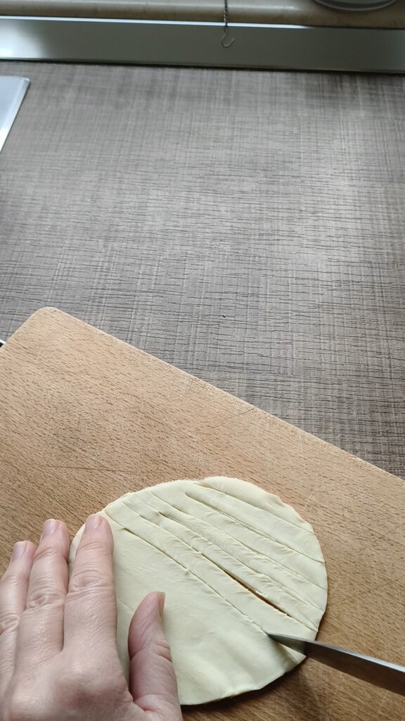 Dérouler la pâte feuilletée et, avec une petite assiette à café ou un bol, découper les formes.