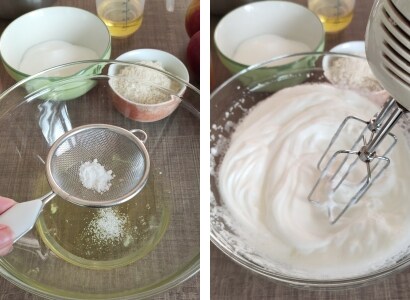 – Séparez les blancs des jaunes. Tamisez la crème de tartre dans les blancs et montez-les en neige ferme avec les fouets électriques.