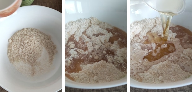 – Dans un autre bol, mettez la farine tamisée, la levure chimique et la farine d’amandes. Mélangez-les et ajoutez ensuite le jus de pomme et l’huile.