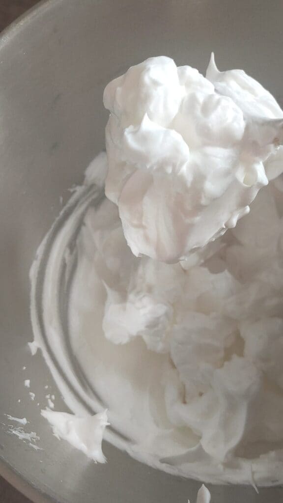 – Mettre dans le robot pâtissier le cream of tartar et la moitié du sucre prévu avec les blancs d’œufs et battre jusqu’à obtenir une meringue très ferme et brillante.
