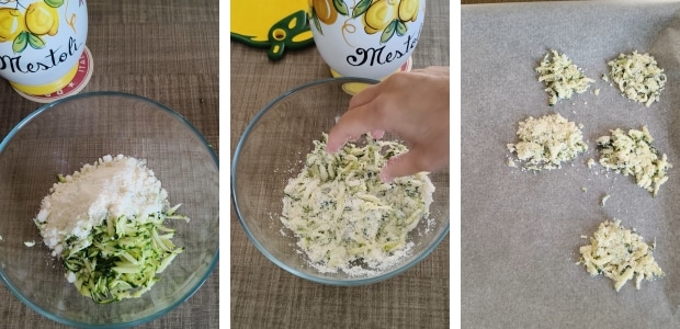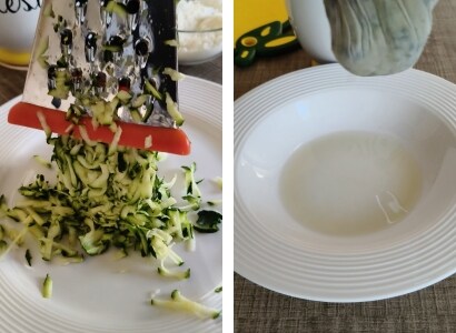 – Râper les courgettes, les saler et les laisser perdre leur liquide de végétation pendant au moins 10 minutes ; une fois le temps écoulé, les transférer dans un torchon propre et presser.