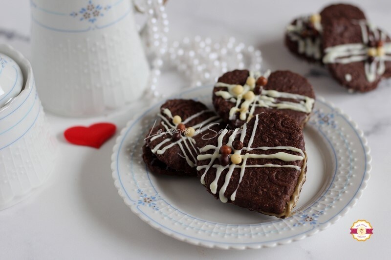 La recette est celle de la très éprouvée pâte sablée au cacao avec laquelle, si vous avez des rouleaux à motifs, vous pouvez obtenir des cœurs vraiment élégants.