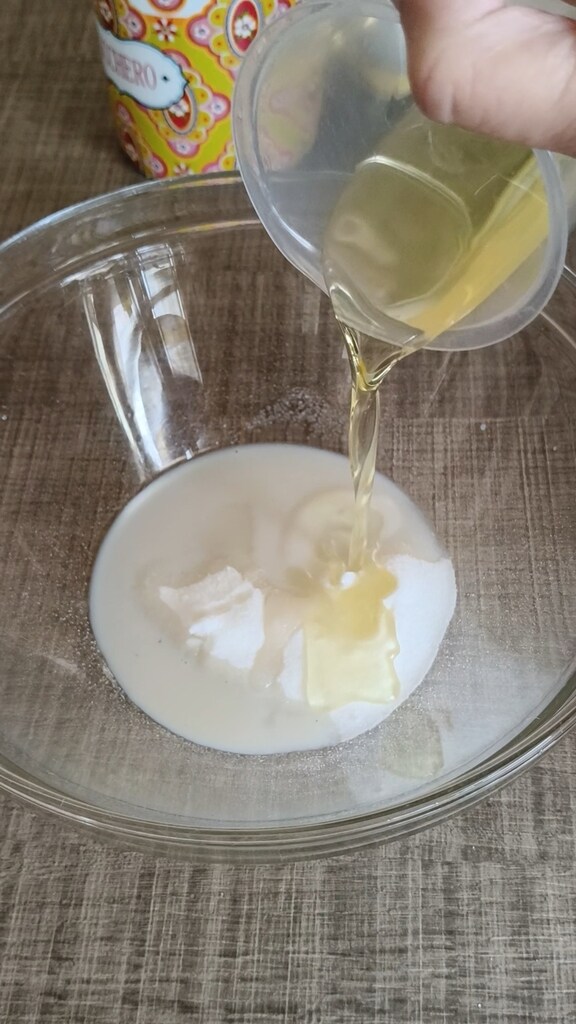 Mélange l’huile, le sucre et le lait (à la main ou Bimby TM6 : 15 sec / vit 3)