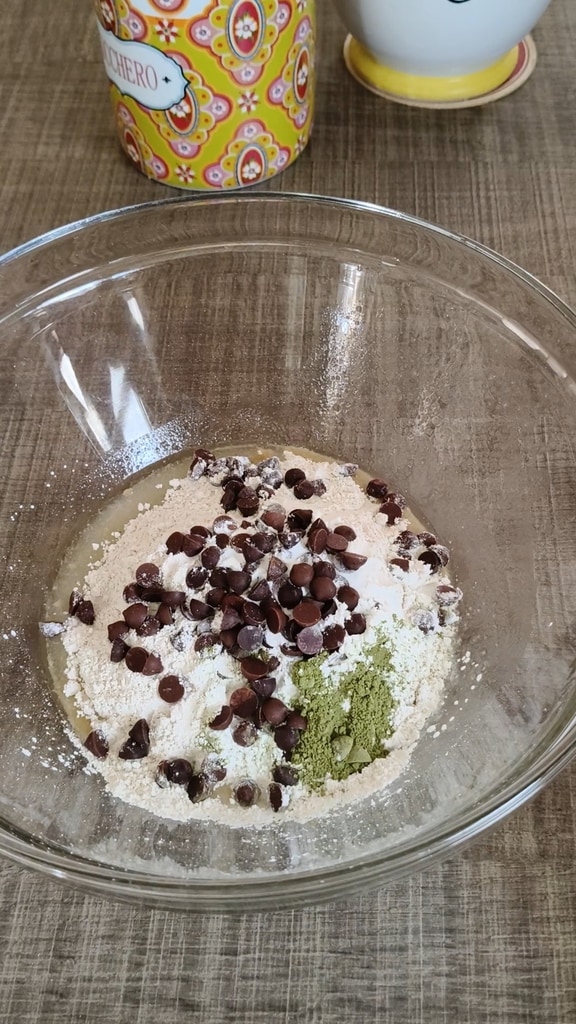 Ajoute la farine d’avoine, le matcha, la fécule de maïs et la levure. Mélange bien jusqu’à former une pâte douce et légèrement compacte. Incorpore également les pépites de chocolat, en en réservant quelques-unes pour la décoration.