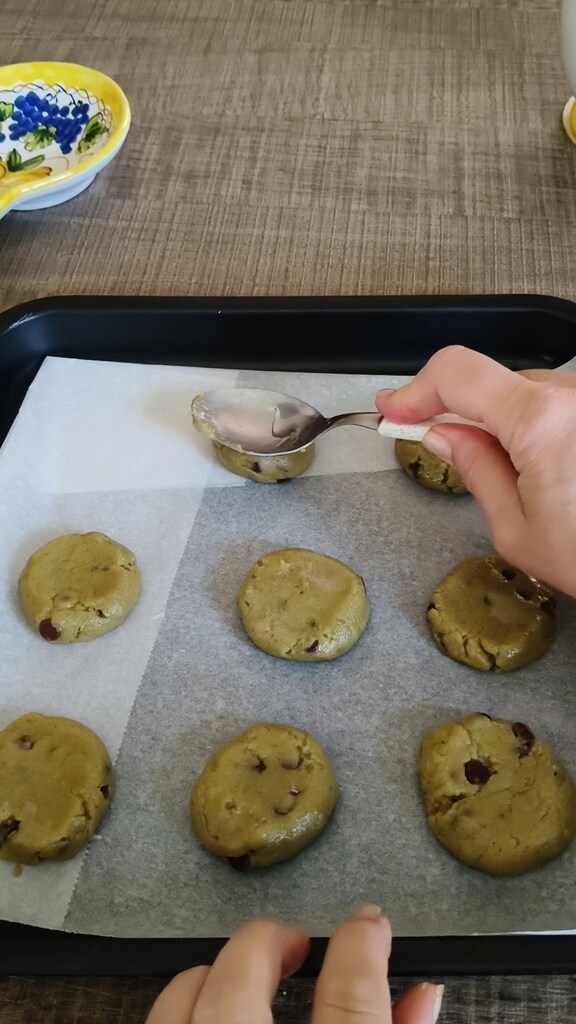 Prends des portions de pâte, forme des boules et dispose-les sur une plaque recouverte de papier sulfurisé. Aplatis-les légèrement avec le dos d’une cuillère humide ou avec les doigts.