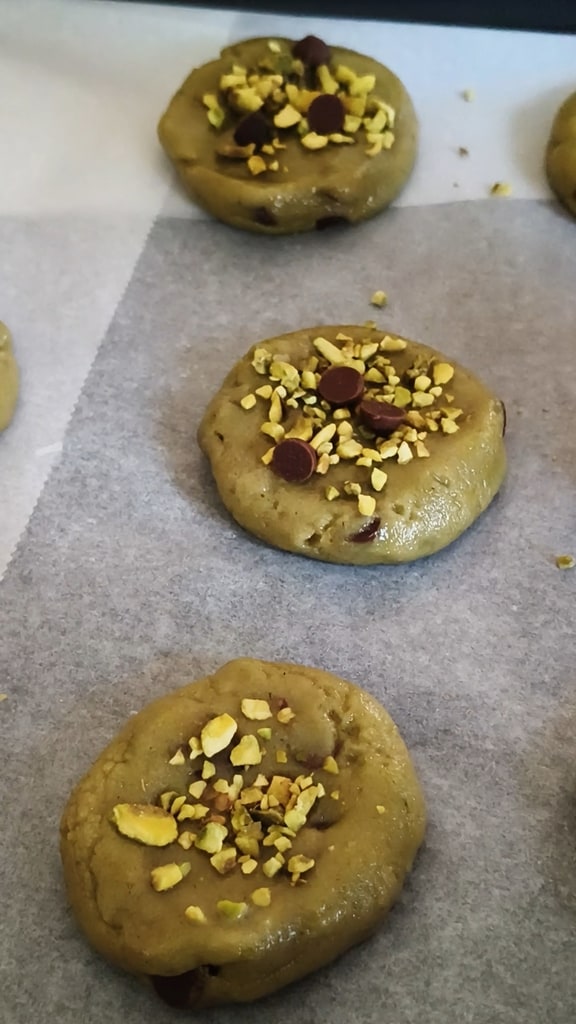 Décore chaque cookie avec des éclats de pistache et les pépites de chocolat réservées, en pressant légèrement.