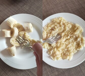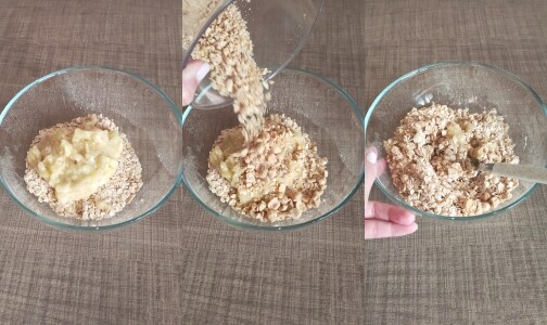 – Verser les flocons d’avoine dans le bol, ajouter la pulpe de banane, les noisettes hachées et mélanger les ingrédients entre eux.