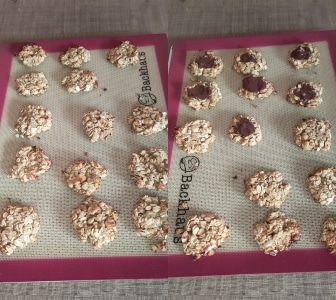 – Sur le tapis en silicone ou le papier cuisson, créer des petits tas de mélange à l’aide d’une cuillère. Cuire dans un four préchauffé à 180°C pendant environ 8/10′ (ils doivent légèrement dorer).