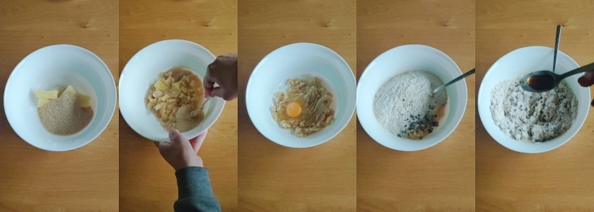 • – Versez le beurre mou et le sucre de canne dans un bol et écrasez avec une fourchette jusqu’à ce que le sucre soit bien incorporé. Ajoutez l’œuf, laissez-le s’incorporer en mélangeant toujours avec la fourchette et enfin, ajoutez les poudres tamisées, les pépites de chocolat, la vanille et la pincée de sel