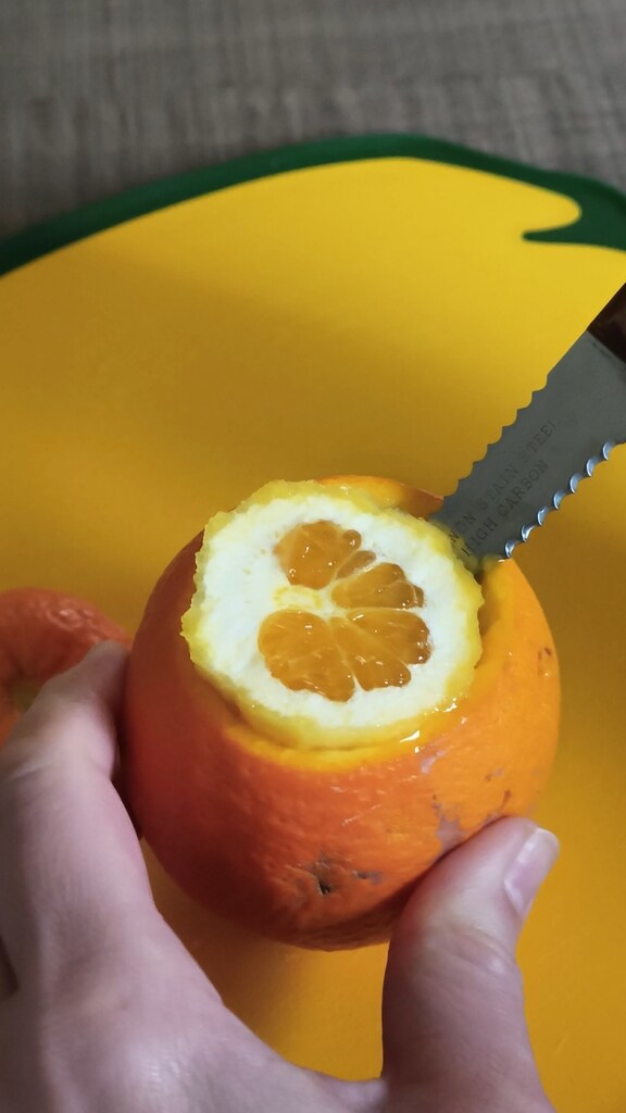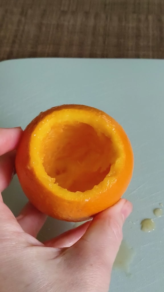Laver les oranges, couper le petit chapeau qui servira à faire le pied des coupelles et les évider en s’aidant d’un petit couteau ou d’une cuillère.