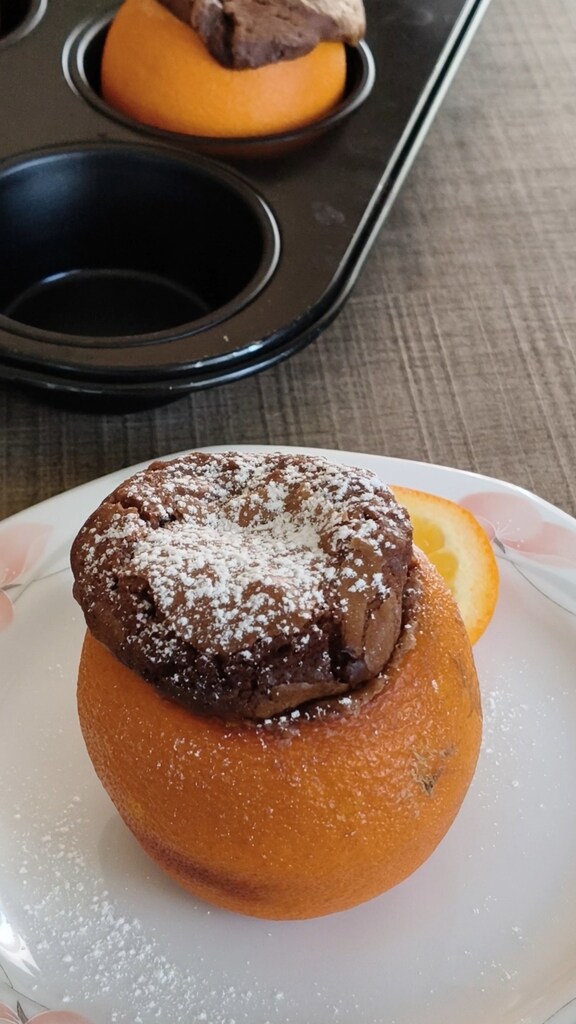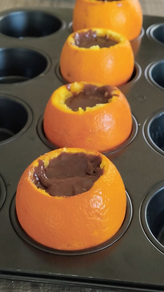 Pour éviter que les oranges ne tombent dans un moule, j’ai préféré les placer dans un moule à muffins. Cuire pendant 18′ à 180°C.