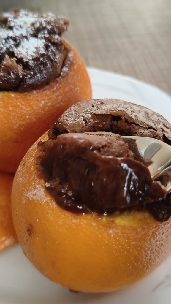 En gros, il s’agit de vider les oranges et de les remplir d’une crème au chocolat qui gonfle ensuite au four comme un soufflé, révélant, lorsque l’on plonge la cuillère, une délicieuse crème.