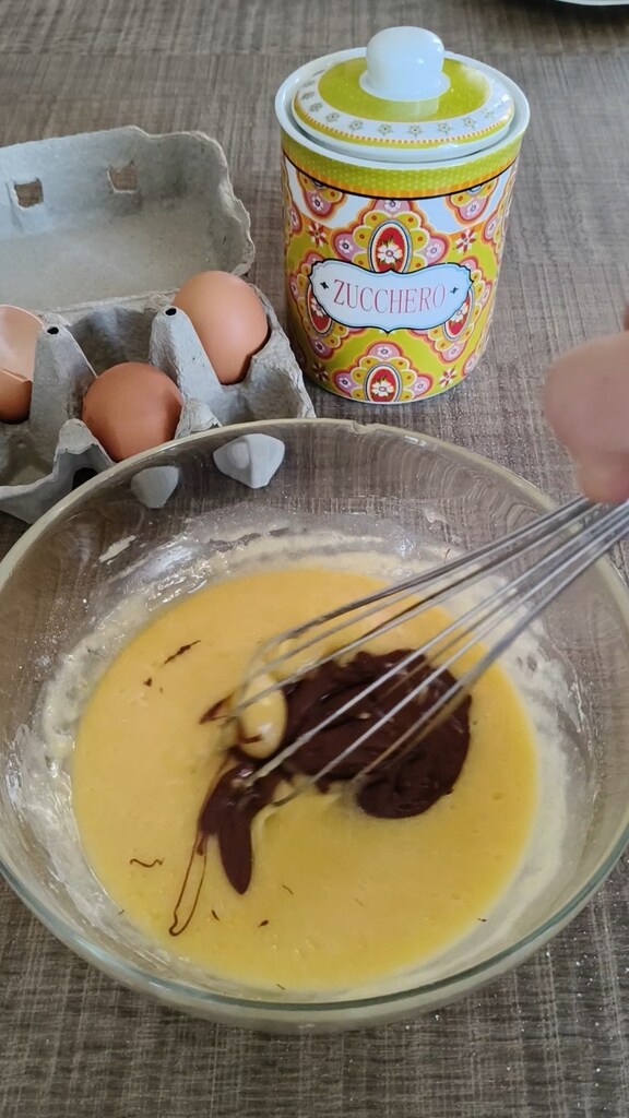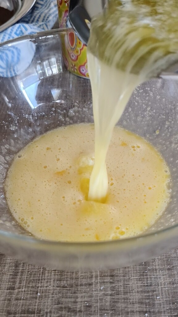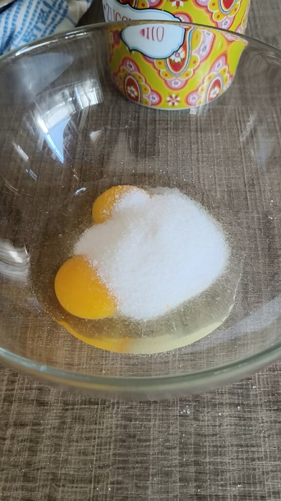 Verser dans un bol l’œuf entier et le jaune; ajouter le sucre et mélanger avec un fouet à main ou une fourchette.
