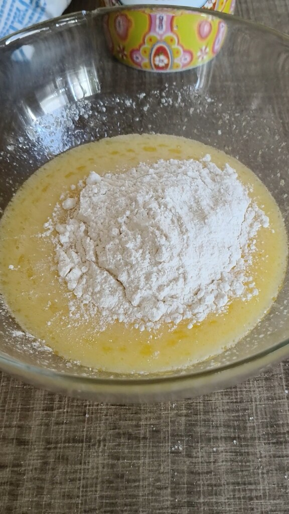 Verser dans le mélange le beurre préalablement fondu et tiédi et mélanger.