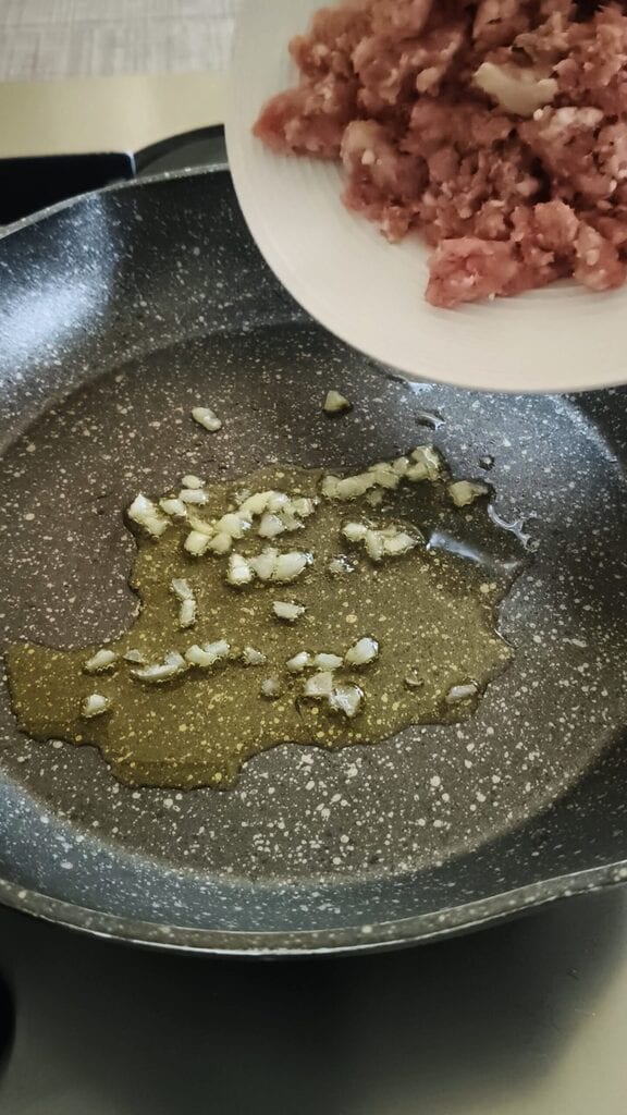 Enlever la peau de la saucisse et la faire revenir dans une poêle avec de l’huile et de l’oignon haché. Laisser la saucisse (celle de Norcia reste plus rouge que la normale) rissoler, puis éteindre et laisser tiédir, en retirant la poêle du feu.