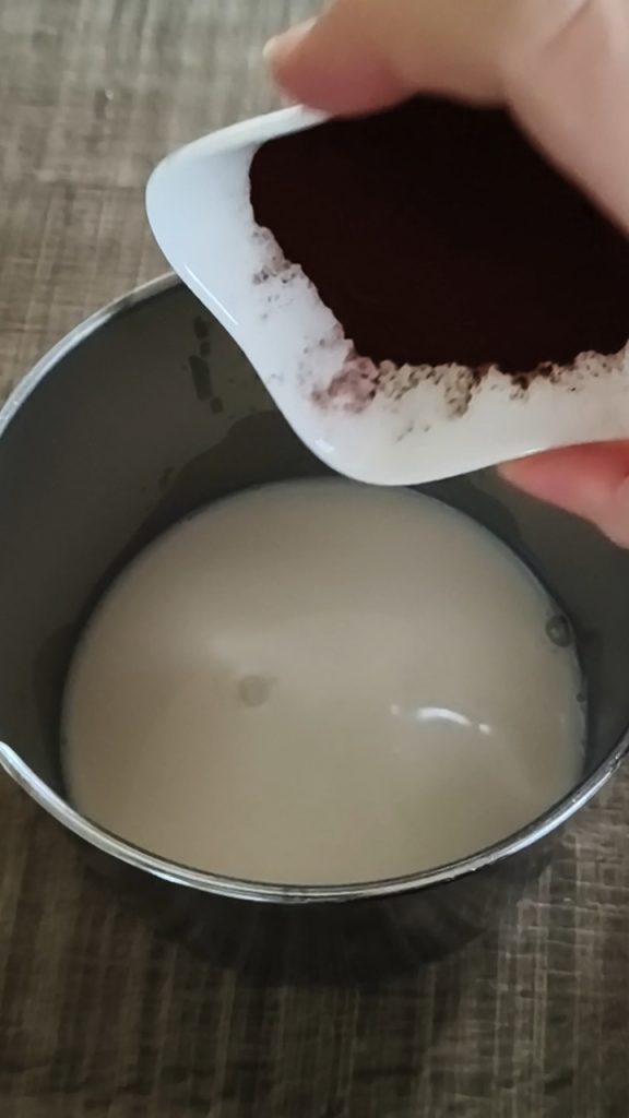 Verser dans le pot à lait ou dans une petite casserole le lait végétal et le cacao.