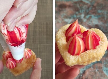– Garnir les petits cœurs avec la crème pâtissière marbrée et servir.