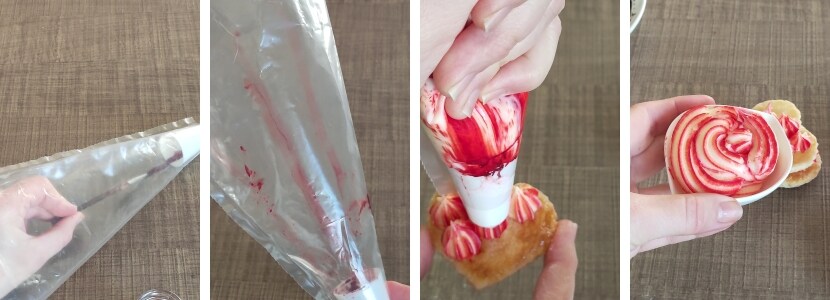 – Munir la poche à douille d’une douille en étoile et avec un petit pinceau trempé dans le colorant rouge, faire des lignes à l’intérieur de la poche. Remplir avec la crème pâtissière et presser.