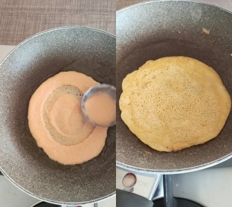 – Chauffer la poêle graissée avec un filet d’huile et verser une petite louche de pâte en essayant de l’étaler autant que possible (si vous estimez qu’elle est trop dense, allongez avec un peu d’eau avant de cuire et mélangez). Retourner après environ 2′ une seule fois.