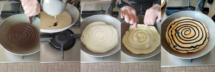 – Huiler légèrement la poêle (22 cm) avec un peu d’huile et la chauffer brièvement. éteindre ou retirer du feu, et avec une main ferme dessiner la spirale de cacao (la poêle chaude cuira légèrement la pâte). Allumer le réchaud, verser une louche de pâte sur la spirale, faire tourner la poêle pour uniformiser la pâte et cuire une ou deux minutes de chaque côté.