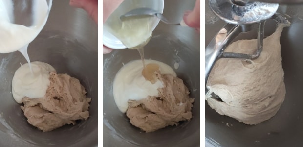 Ajouter le yaourt, le miel et le reste de la farine et pétrir en veillant à ce que le bol soit toujours propre (la pâte doit être bien accrochée au crochet).