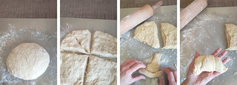 – Tourner la pâte sur le plan de travail fariné, la plier et former une boule. Étaler délicatement, et avec la roulette, couper la pâte en 12 triangles.