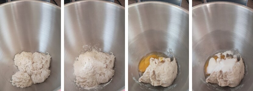 – Dans le bol du robot pâtissier, ajouter le poolish et la farine nécessaire pour former la pâte. Ensuite, en deux fois, ajouter l’œuf, le sucre et une partie de la farine, pétrir jusqu’à ce que la pâte soit lisse puis ajouter l’autre œuf avec le reste du sucre, le reste de la farine et le sel.