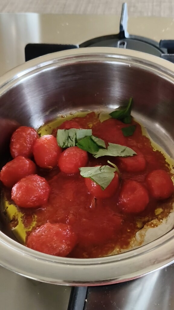 Faire revenir dans une petite casserole l’huile et l’ail (en poudre ou une gousse fraîche) avec les tomates sautées, le basilic grossièrement déchiré et une pincée de sel. Cuire à feu doux, couvert, pendant 10 minutes maximum.