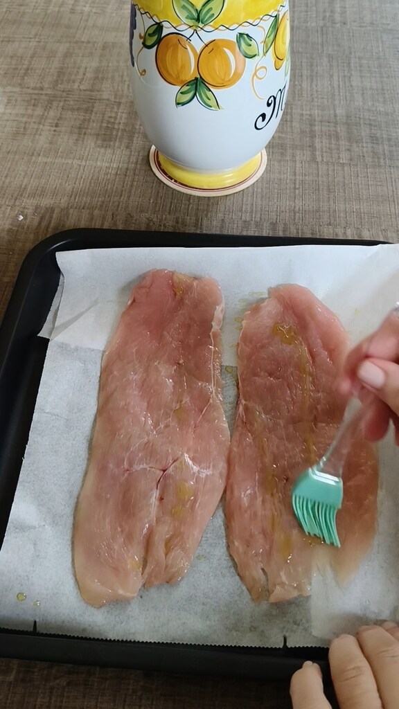 Pendant ce temps, recouvrir d’un papier sulfurisé légèrement huilé une plaque et couvrir avec la viande. Huiler et badigeonner d’un peu d’huile la surface et cuire au four chaud à 200°C pendant 3 minutes.