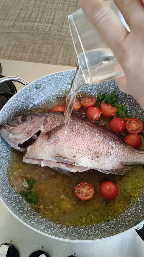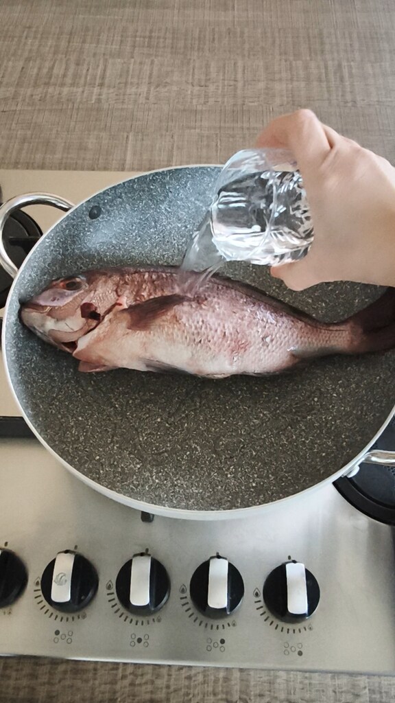 Mettez la dorade dans la cocotte et arrosez-la avec 60 ml d’eau.