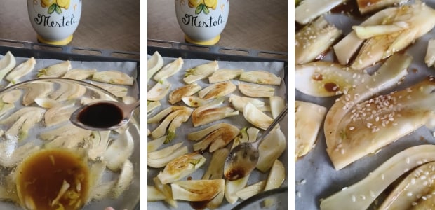 Disposer les tranches de fenouils sur la plaque du four recouverte de papier sulfurisé et assaisonner l’émulsion restante au fond du bol avec le vinaigre balsamique; mélanger et verser sur les fenouils. Ajouter une pincée de graines de sésame et enfourner pendant environ 25 minutes. Ils doivent dorer. Servir chaud ou tiède avec un peu de persil.