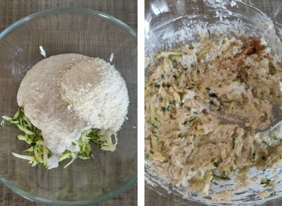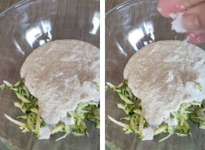 – Verser la pâte dans une assiette avec la courgette préalablement râpée en ajoutant une pincée de sel.