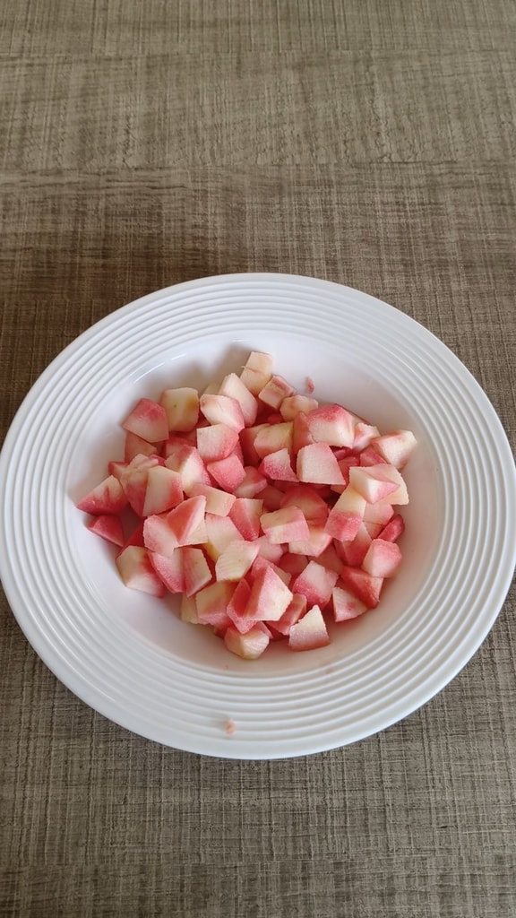 Éplucher une pomme et la couper en dés. CONSEIL: pour éviter qu’elle ne s’oxyde, au lieu de mettre du jus de citron, je mouille une feuille de papier absorbant de type Scottex et je la pose sur le fruit.