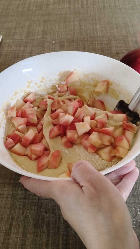 Incorporer à la pâte les dés de pomme en les intégrant avec des mouvements délicats.