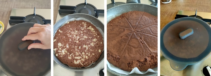 Dans le passé, j’avais déjà essayé de faire le gâteau à la vapeur, sur le gaz, une recette vraiment valable, où cependant on utilise un moule dans une casserole ou une poêle contenant de l’eau… ici, grâce au diffuseur de flamme, on peut cuire directement le gâteau dans la poêle.