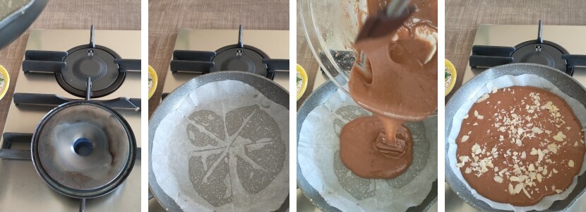 – Placer le diffuseur de flamme sur le petit feu, tapisser la poêle avec du papier sulfurisé, verser le mélange au cacao et décorer la surface avec les amandes effilées.