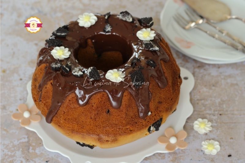 Tamisez la farine avec la levure et ajoutez-les progressivement au mélange, en remuant délicatement pour éviter les grumeaux. Ajoutez une pincée de sel et incorporez les biscuits émiettés à la main, en mélangeant avec une spatule. Versez la pâte dans un moule à ciambelle graissé de 22–24 cm.