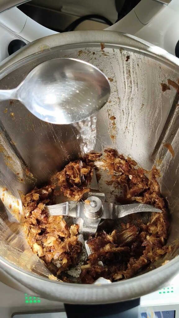 Mettez les dattes dans le bol : 10 sec. vit. 6, puis ajoutez 1 cuillère d’eau et mixez 10 sec. vit. 8.