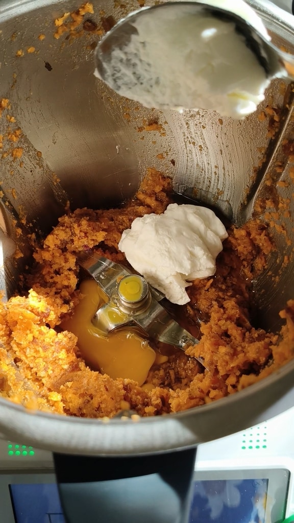 Ajoutez les œufs, le yaourt, l’huile, le sel et la vanille : 20 sec. vit. 4.