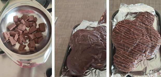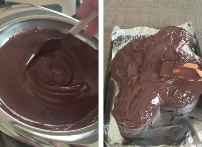 – Faire fondre le chocolat noir au bain-marie ou au micro-ondes et l’étaler sur la surface du gâteau. Attendre qu’il sèche.