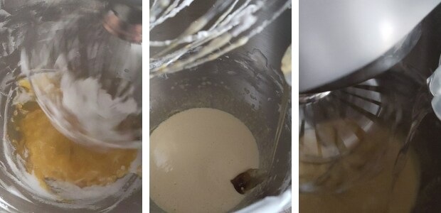 – Transférer les blancs montés dans un bol et verser les jaunes et le sucre restant dans le bol du mélangeur (il n’est pas nécessaire de rincer le bol et le fouet), monter puis verser l’huile et l’eau.
