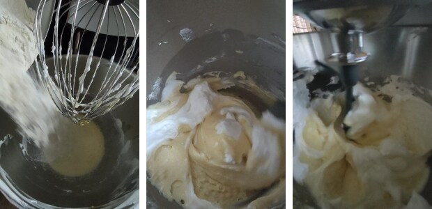 – À ce stade, verser la farine tamisée avec la levure et ajouter délicatement les blancs montés. (si vous avez la spatule pour le pandispagna, utilisez-la, sinon retirez le bol de la machine et mélangez délicatement avec une spatule)