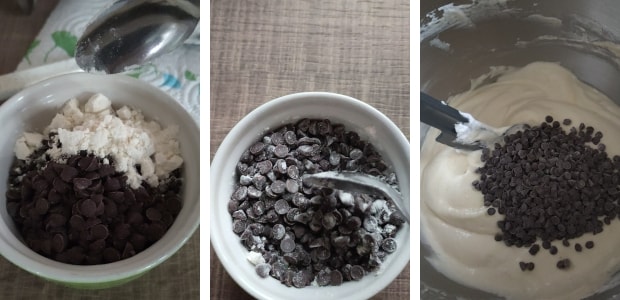 – Fariner les pépites de chocolat froides du congélateur avec une cuillère à café de farine, enlever l’excès en les mettant dans une passoire et les ajouter à la pâte en mélangeant délicatement.