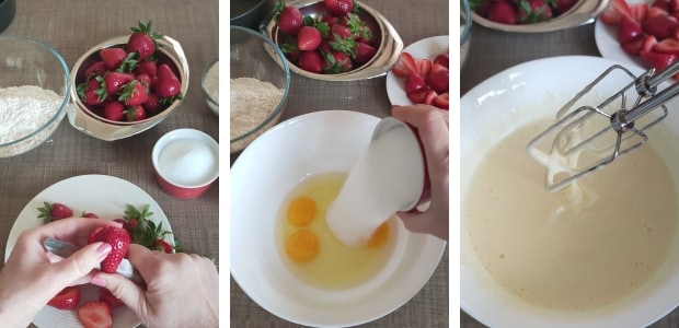 – Laver, équeuter et couper les fraises en deux et les mettre de côté pour le moment; Battre les œufs avec le sucre avec des fouets électriques, jusqu’à obtenir un beau mélange clair et mousseux.