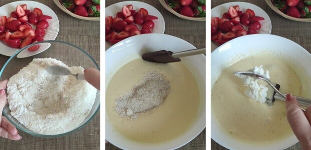 – Mélanger ensemble la farine complète, la noix de coco râpée et la levure chimique; ajouter les poudres au mélange d’œufs et de sucre en alternant avec des cuillerées de yaourt.