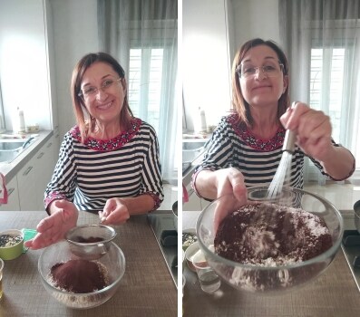 – Verser dans un saladier la farine tamisée, ajouter le cacao, la levure et mélanger le tout.